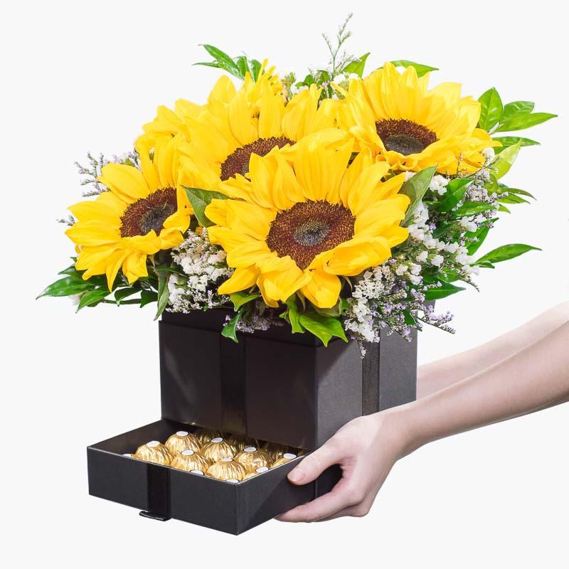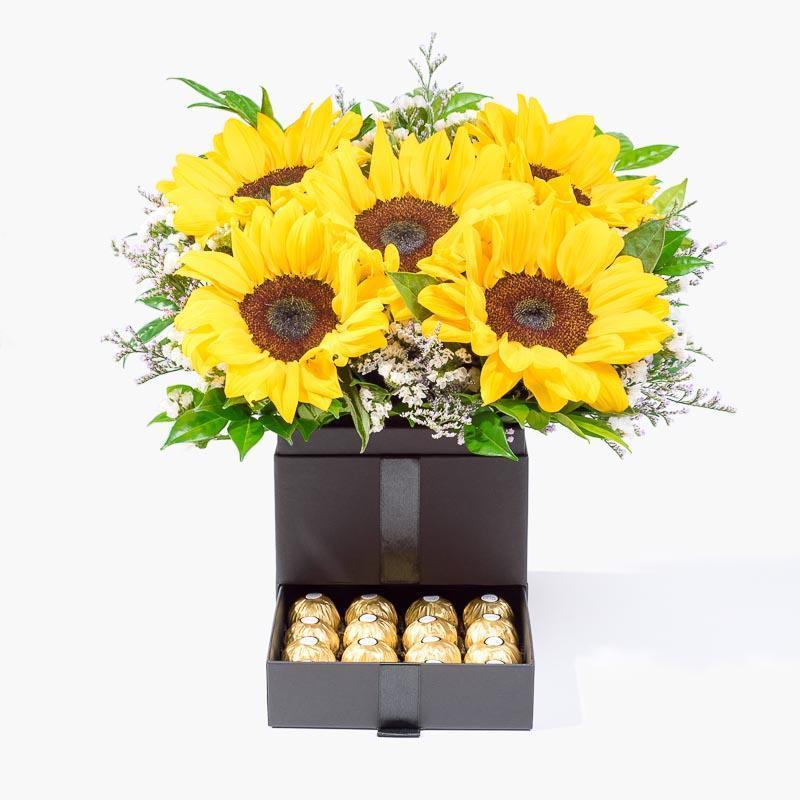 A treasure trove of timeless romance, passion and a little bit of magic; presented elegantly in a box of fresh sun flowers and chocolates.