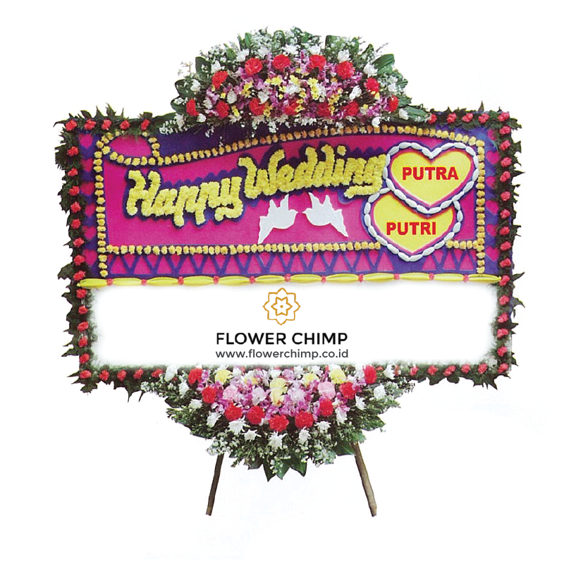 Size 1,25 m x 2 m, pink background, with two medium sized flower arrangements at the top and bottom of the flower board as well as flower frame.