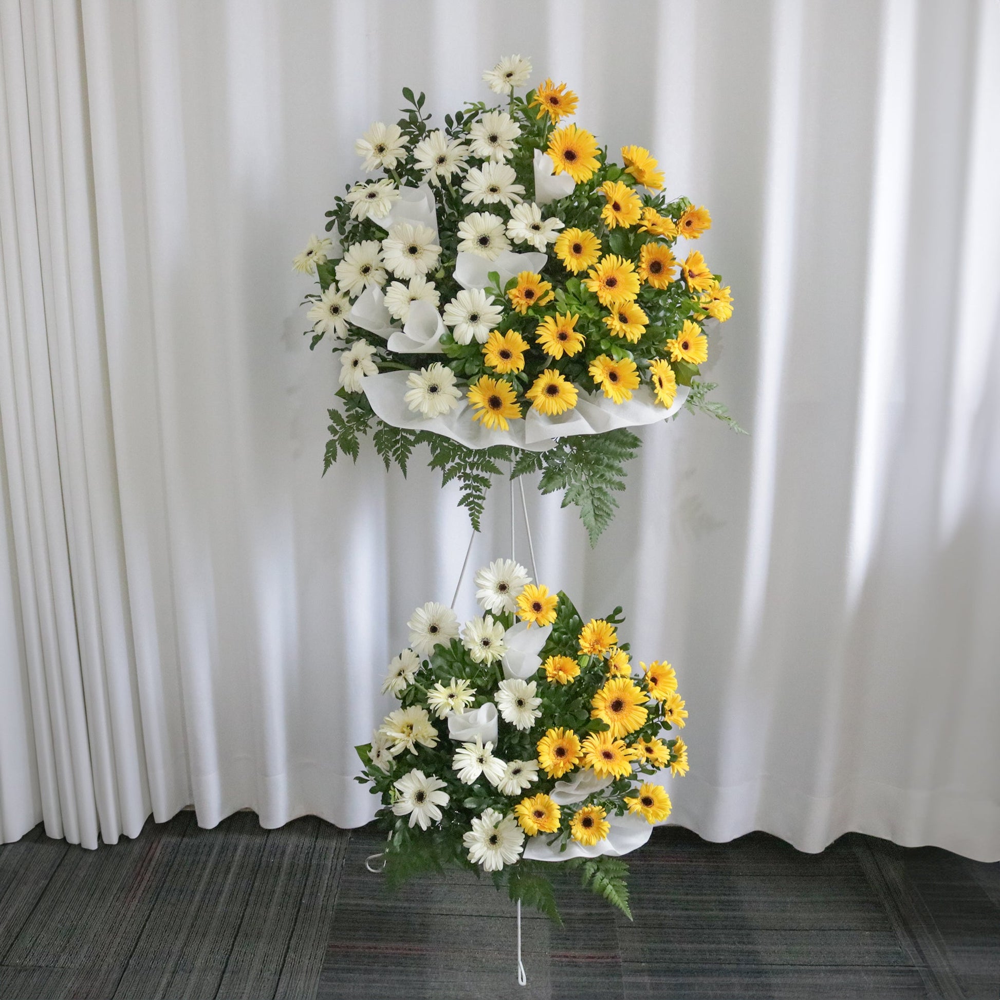 Standing Hermione is a harmonious flower stand that pairs the serene elegance of white gerberas with the joyful vibrancy of yellow gerberas. Together, they form a symphony of color that is both uplifting and balanced. The paku leaves weave through the arrangement, enhancing the natural harmony and adding a refined touch to this dignified display.