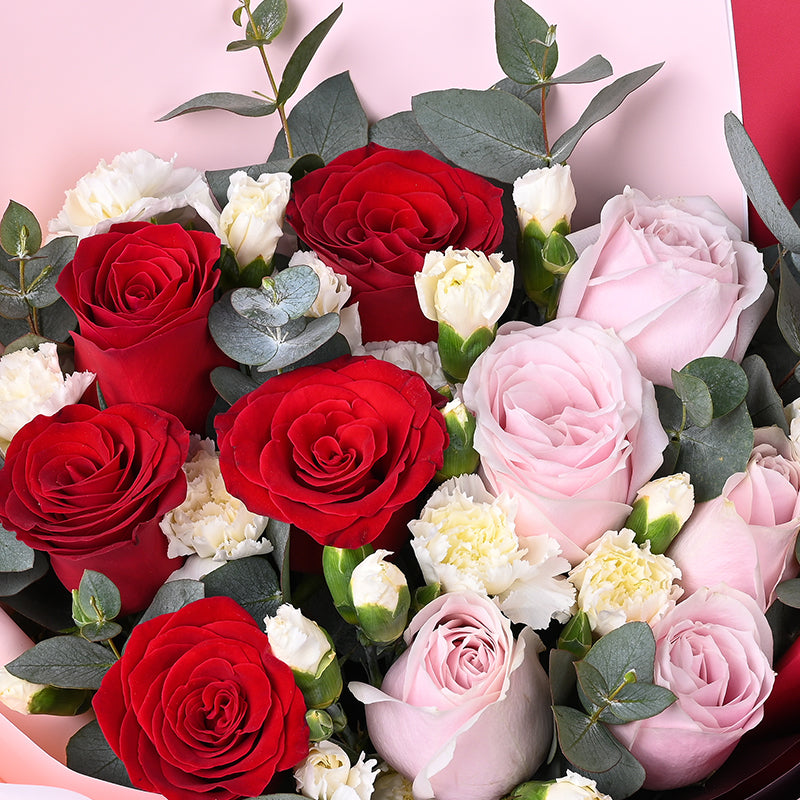 Red  Rose (5 Stalks), White Statice (4 Stalks), Parvifolia Eucalyptus (3 Stalks)