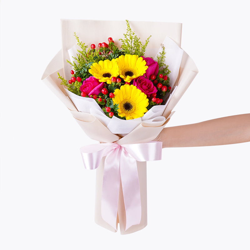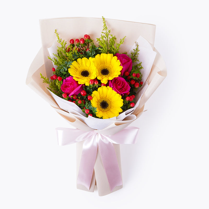 Red Berry (2 stalks), Yellow Gerbera (3 stalks), Dark Pink Rose (3 stalks), Gold Peacock